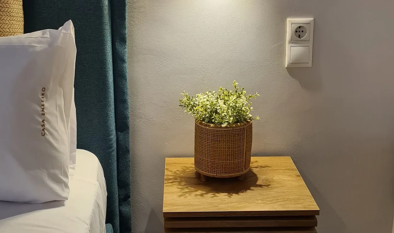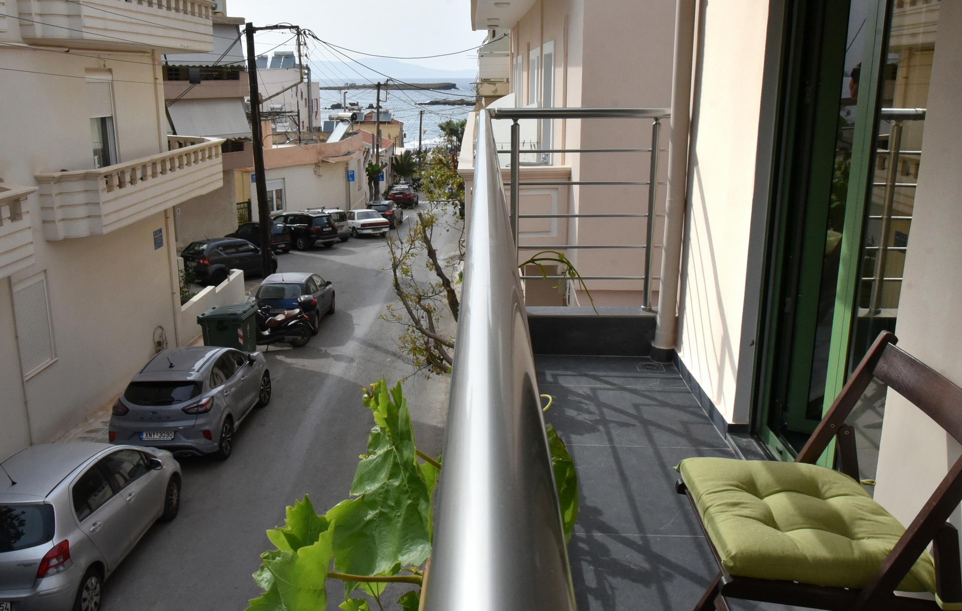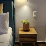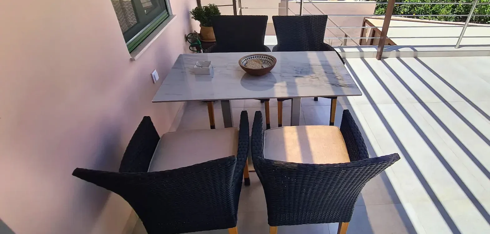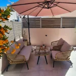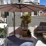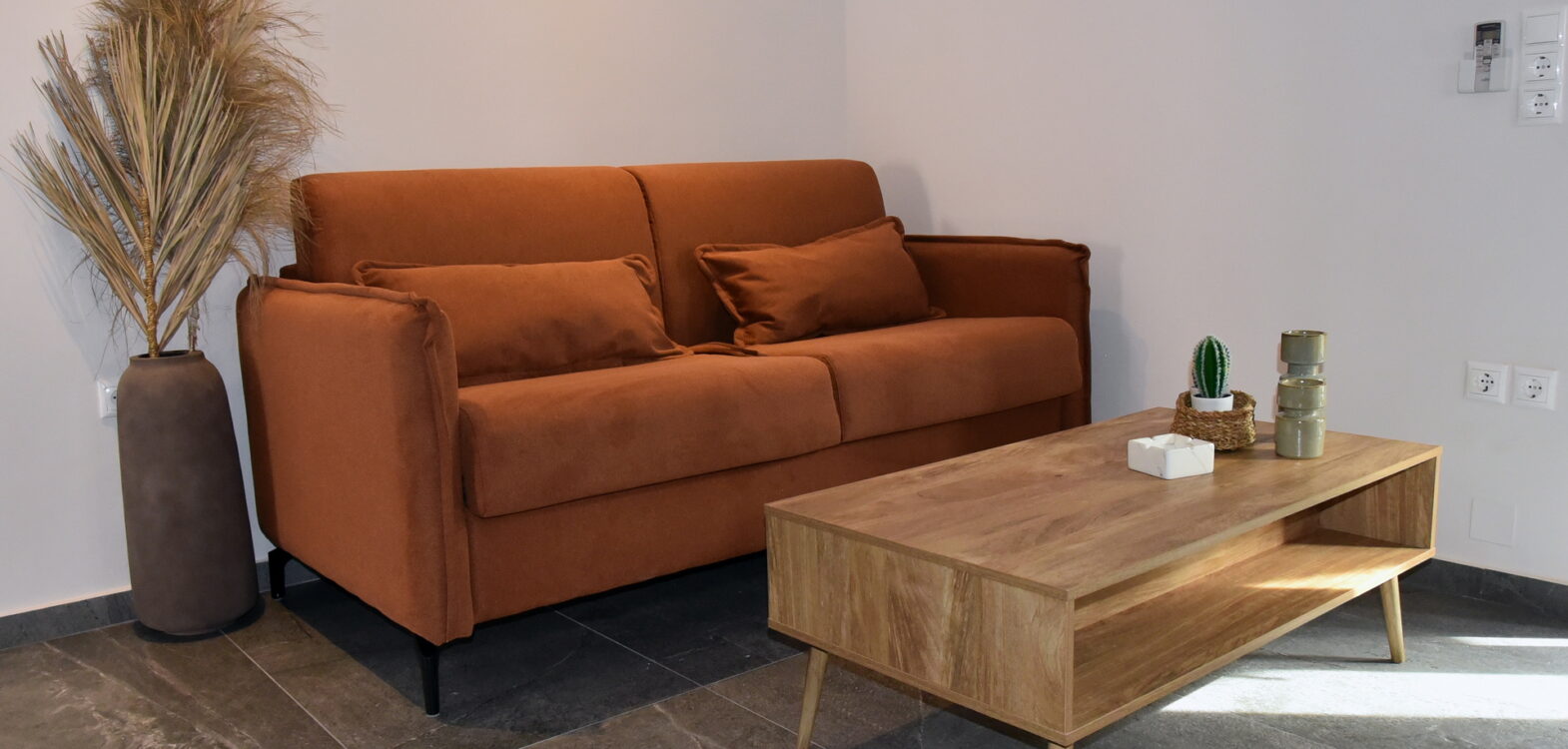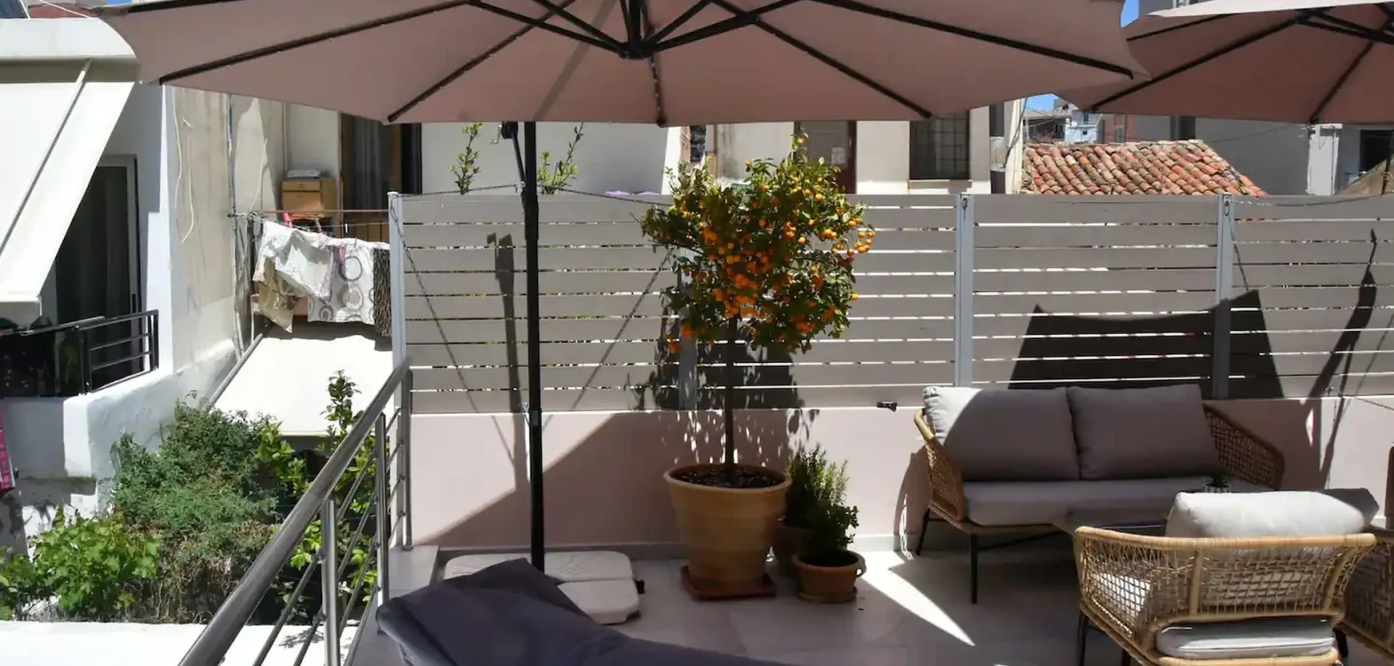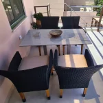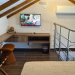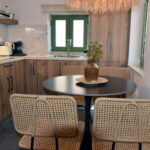 Room 201 is a quadruple room featuring a large double bed and a sofa bed, perfect for families. It includes a private bathroom and is located just 50 meters from Nea Chora beach. The room is equipped with air conditioning, a Smart TV, 100 Mbps Wi-Fi, and a fully equipped kitchen. Guests also have access to a private terrace furnished with dining and living room furniture.