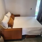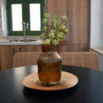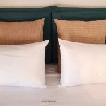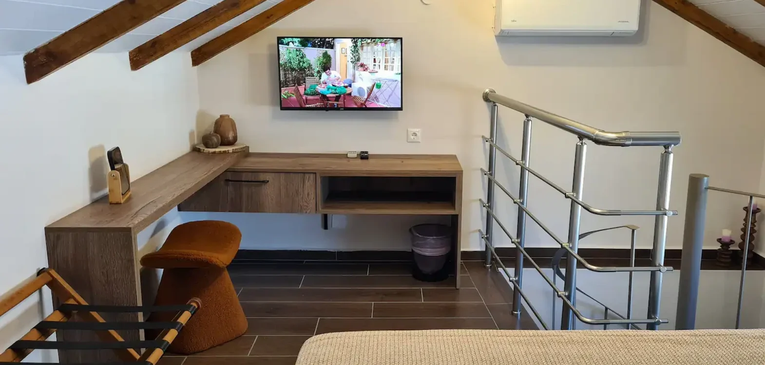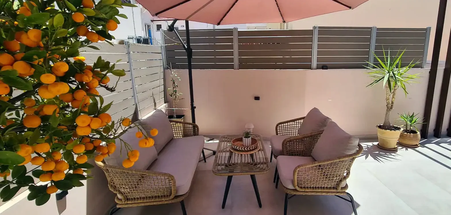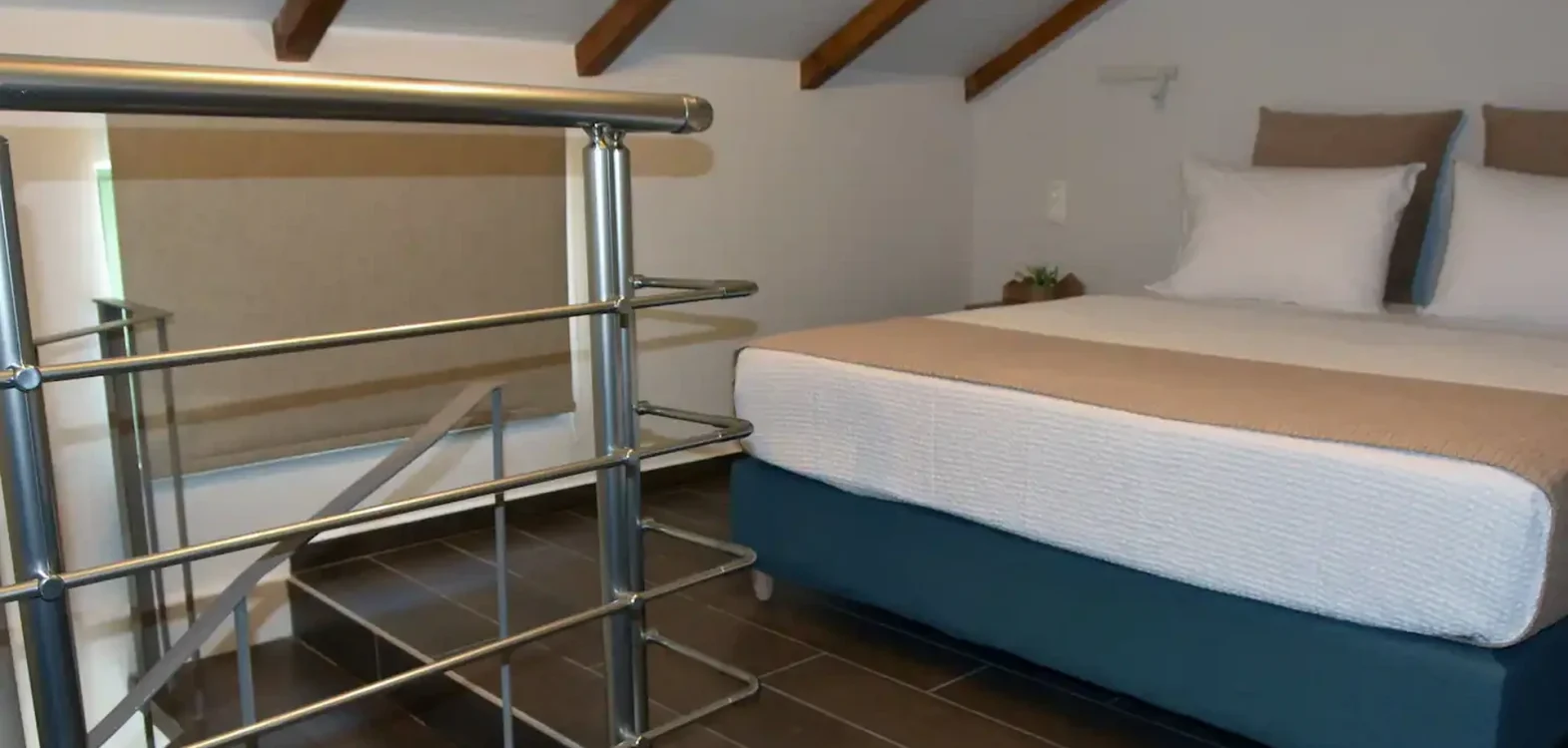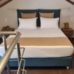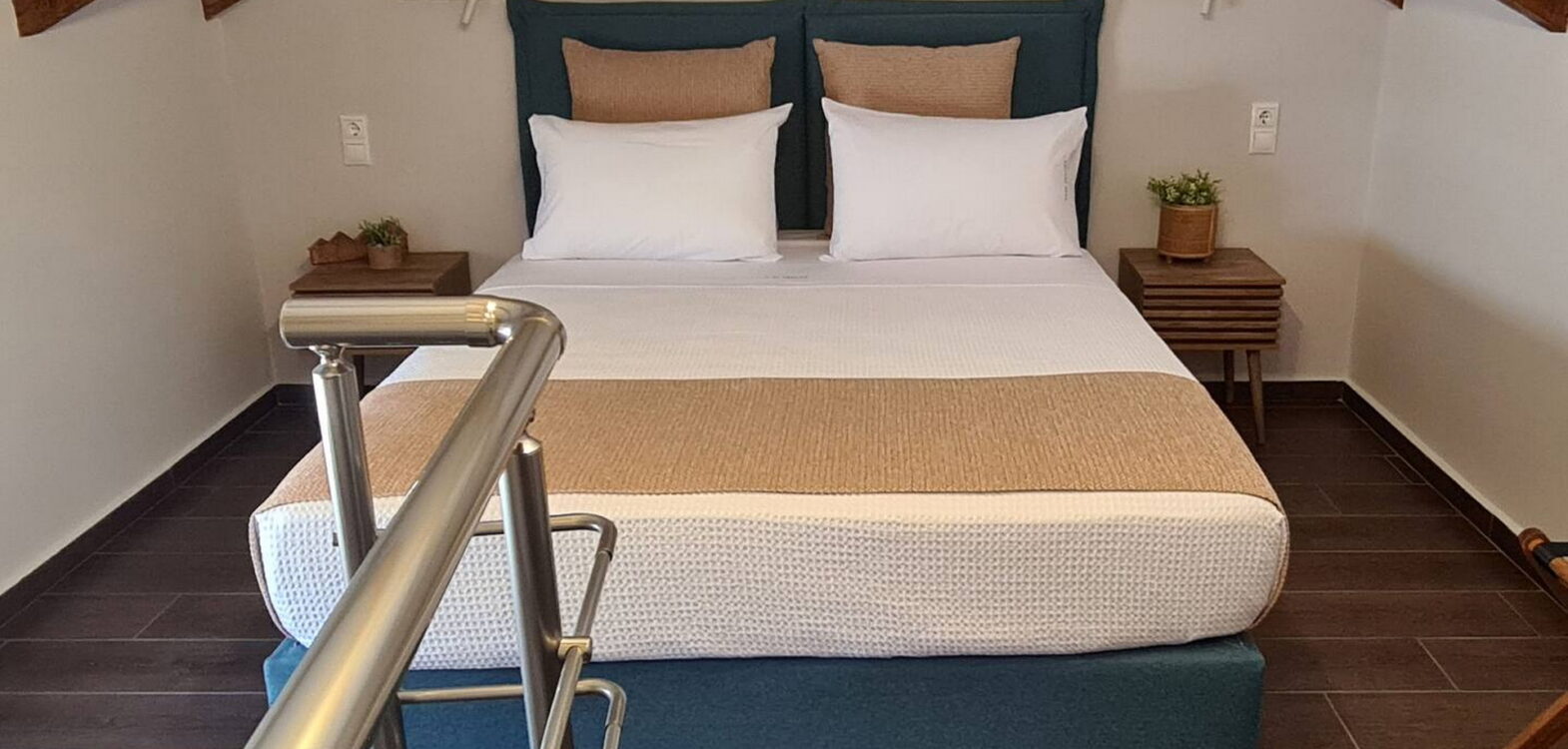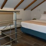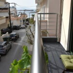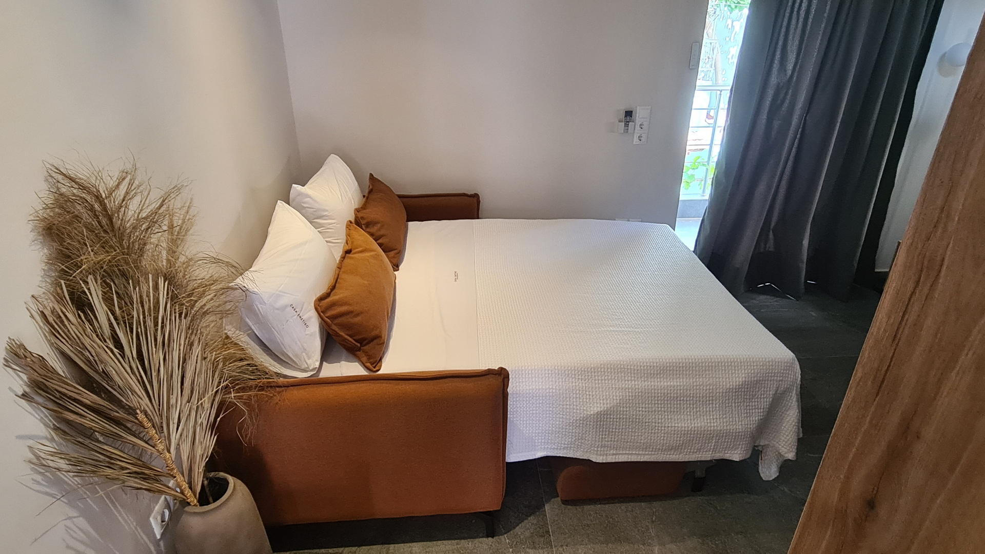Room 201 is a quadruple room featuring a large double bed and a sofa bed, perfect for families. It includes a private bathroom and is located just 50 meters from Nea Chora beach. The room is equipped with air conditioning, a Smart TV, 100 Mbps Wi-Fi, and a fully equipped kitchen. Guests also have access to a private terrace furnished with dining and living room furniture.