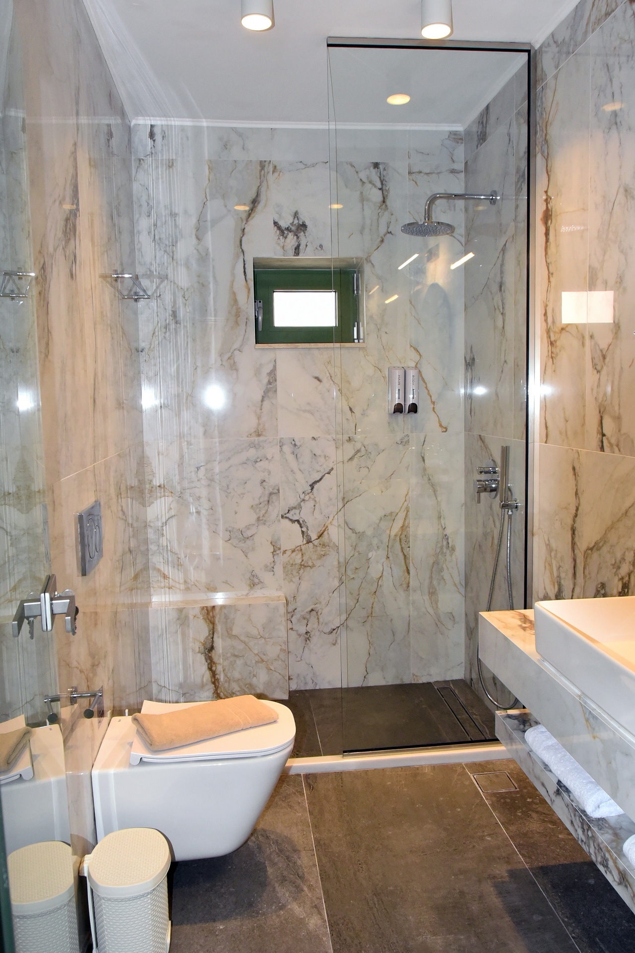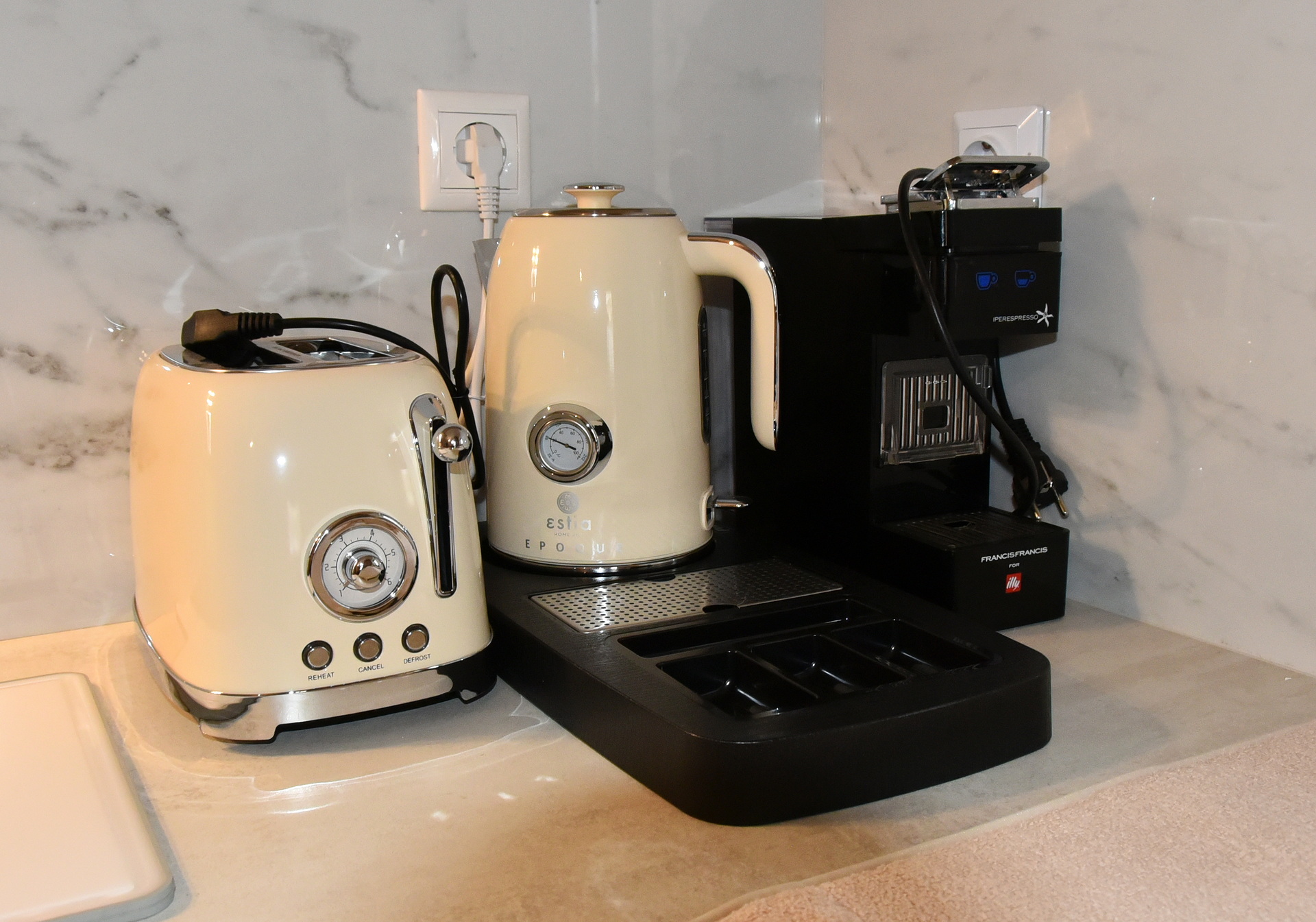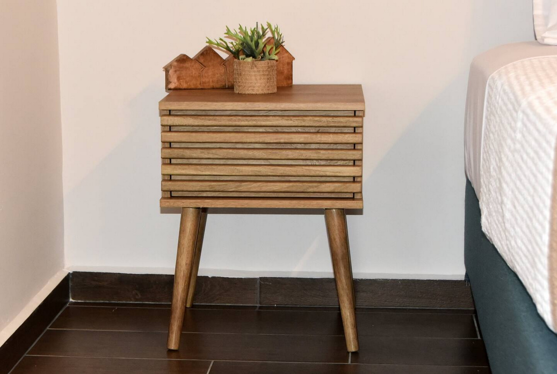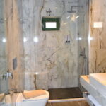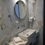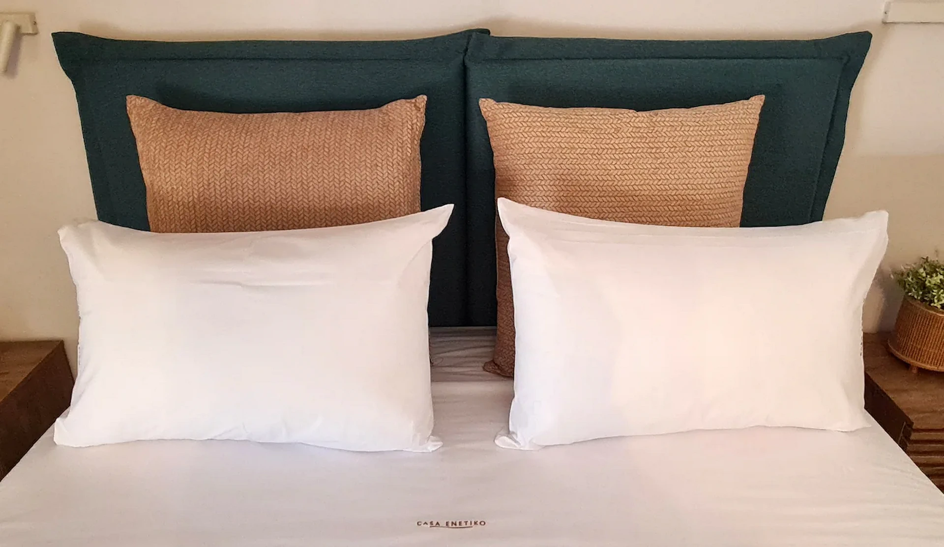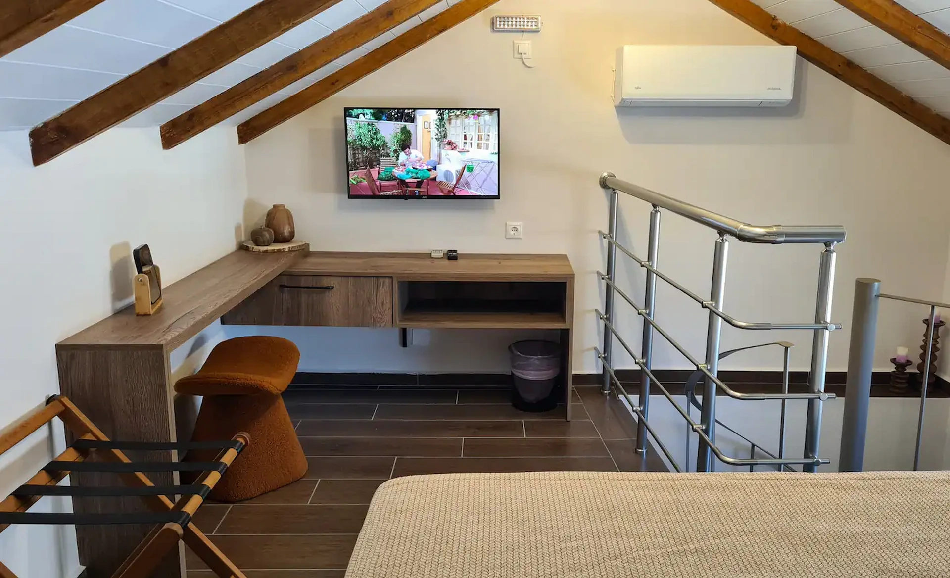 Room 201 is a quadruple room featuring a large double bed and a sofa bed, perfect for families. It includes a private bathroom and is located just 50 meters from Nea Chora beach. The room is equipped with air conditioning, a Smart TV, 100 Mbps Wi-Fi, and a fully equipped kitchen. Guests also have access to a private terrace furnished with dining and living room furniture.